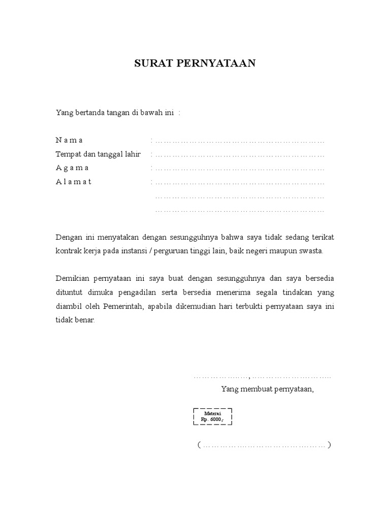 Contoh Surat Pernyataan Tidak Terikat Kontrak Kerja